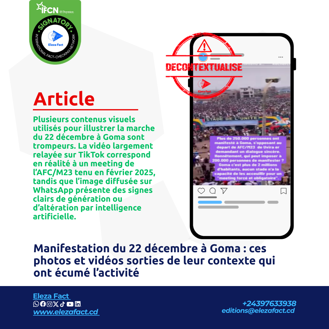 Les vérifications menées par Eleza Fact montrent que plusieurs contenus visuels utilisés pour illustrer la marche pacifique du 22 décembre à Goma sont trompeurs. La vidéo largement relayée sur TikTok correspond en réalité à un meeting de l’AFC/M23 tenu en février 2025, tandis que l’image diffusée sur WhatsApp présente des signes clairs de génération ou d’altération par intelligence artificielle.