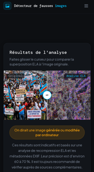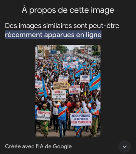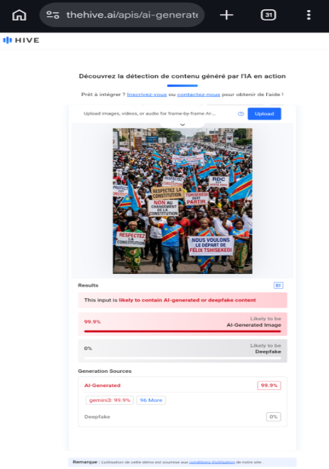 C’est dans ce climat tendu qu’une image présentée comme montrant une manifestation à Kinshasa contre un changement de la Constitution a largement circulé sur les réseaux sociaux. Face à l’ampleur de la rumeur, Eleza Fact a enquêté se servant de la recherche d’image inversée et d’outils de détection d’images synthétique à l'instar de Hive Moderation, SynthID ou encore Fake Image Detector qui tous révèlent que l’image a été généré par IA.