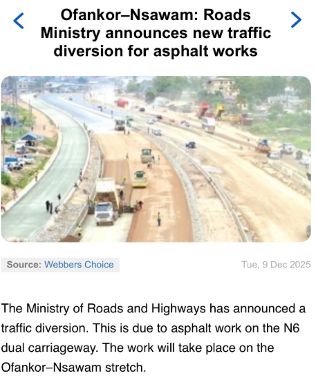 Par ailleurs, un article (archivé ici) publié mardi 9 décembre dernier sur le site Ghanéen ghanawebbers.com utilisant cette image comme illustration, relayé un avis au public diffusé le dimanche 7 décembre 2025 par le ministère ghanéen des infrastructures. Cet avis précise que la section comprise entre Ofankor et White House devait être fermée du lundi 8 au dimanche 14 décembre, afin de permettre aux entreprises de poser la couche finale sur ce tronçon, après l'achèvement des travaux préparatoires à Ofankor.