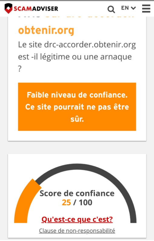 Pour compléter notre recherche nous avons analysé le lien via l'outil scamadviser  (archivé ici). Celui-ci révèle que le site a un faible niveau de confiance. Il obtient seulement 25/100 comme score de fiabilité, ce qui signifie que le site « pourrait ne pas être sûr ». Un tel score est typique des sites utilisés dans des tentatives d’arnaque, notamment ceux créés pour collecter des données personnelles ou tromper les internautes avec de fausses promesses de gains. Ce résultat renforce encore l’alerte selon laquelle le lien circulant sur WhatsApp n’a rien d’officiel et constitue un risque réel pour les utilisateurs.