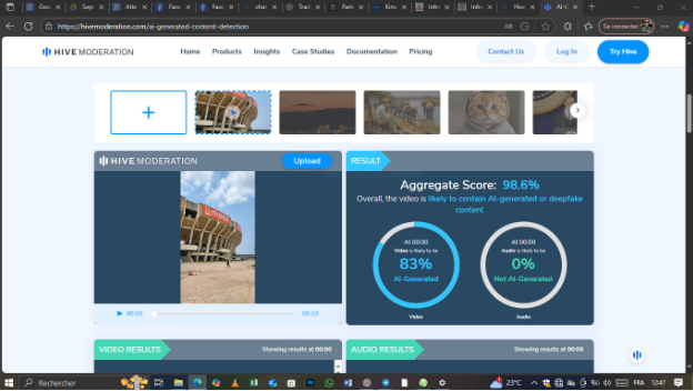 Pour parfaire nos recherches, nous avons soumis la vidéo à l’outil Hive Modération, spécialisé dans la détection de contenus générés par intelligence artificielle. Cet outil a attribué à la vidéo un score de 98,8 %, indiquant une très forte probabilité qu’elle ait été générée à l’aide de l’IA.