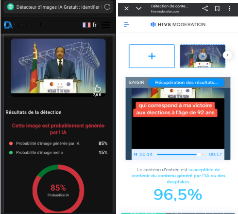 L’analyse menée par Eleza Fact démontre que la vidéo attribuant à Paul Biya des propos célébrant le but de Chancel Mbemba est fausse. Les analyses ont montré que, bien que certaines images soient authentiques, l'audio et les modifications visuelles étaient des éléments trompeurs. Les outils de détection d’IA (Hive Moderation à 96,5 %, Decopy AI à 85 %, AI Video Detector à 55 %) confirment que la séquence est manipulée ou altérée.