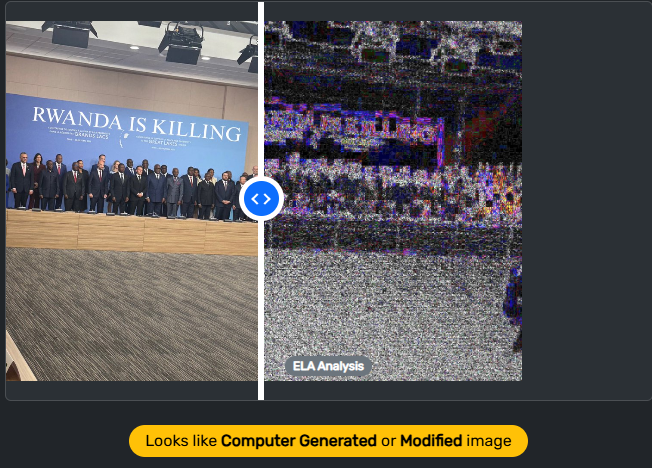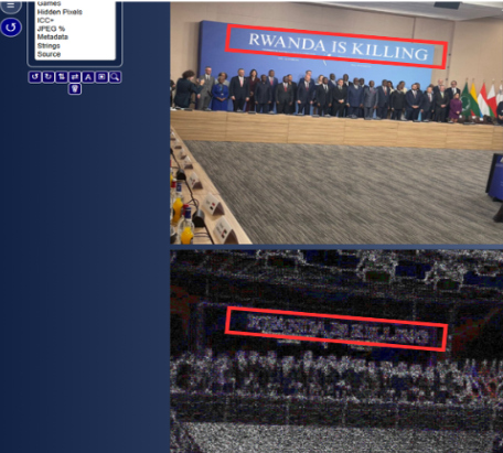 En outre, l’analyse d’erreur de niveau (ELA) réalisée à l’aide de Fotoforensics démontre que les zones correspondant à l’inscription “RWANDA IS KILLING” présentent une intensité lumineuse et un niveau de compression différents du reste de l’image. Cela prouve que ces éléments ont été insérés après la capture originale. Tandis que les visages des participants et l’arrière-plan du décor conservent une cohérence graphique uniforme, les lettres ajoutées affichent un contraste anormal, typique des images générées ou retouchées par intelligence artificielle.
