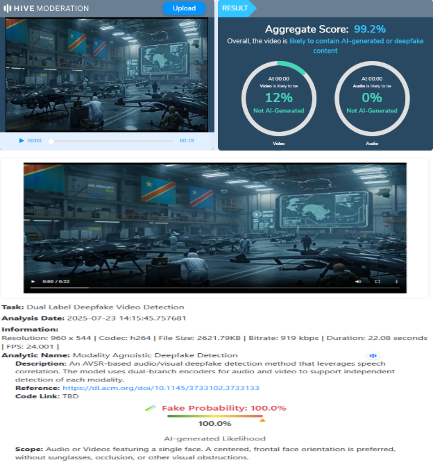 Pour confirmer cette hypothèse, Eleza Fact a utilisé les outils Hive Moderation, qui a conclu à 99 % de probabilité que la vidéo a été créée par IA, et DeepFake-O-Meter, qui a, quant à lui, attribué une probabilité de 100 %. Par ailleurs, une recherche par mots-clés tels que « RDC base militaire aérienne » n’a permis de retrouver aucune référence officielle ou médiatique à cette vidéo.