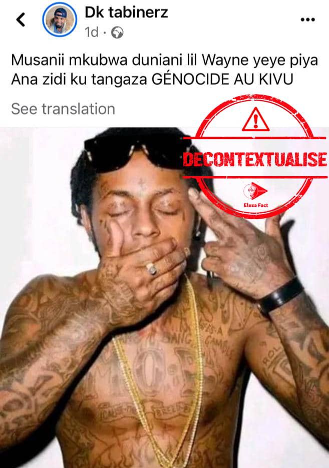 "Le plus grand artiste mondial, Lil Wayne, dénonce aussi le génocide qui se passe au Kivu '', ( traduit de Swahili ) ,lit-on sur le mur Facebook Dk Tabinerz accompagnant l'image de Lil Wayne.