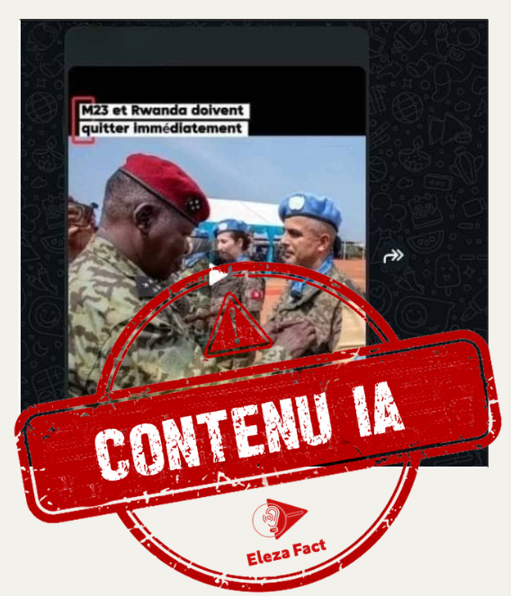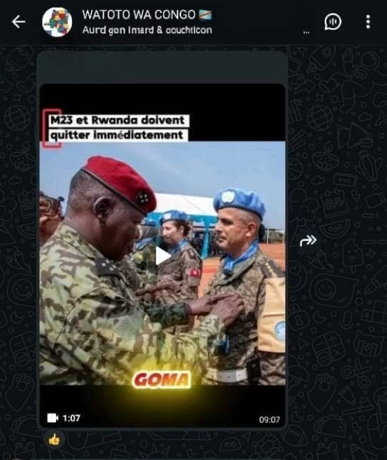 C’est dans ce contexte qu’Eleza Fact a découvert une vidéo partagée le dimanche 15 février 2026 dans un groupe WhatsApp. La séquence montre des images de casques bleus et de cadres de l’AFC/M23 en tenue militaire, accompagnées d’une voix off affirmant que la MONUSCO se préparerait à lancer une attaque contre l’AFC/M23 à Goma sous l’égide des États-Unis.