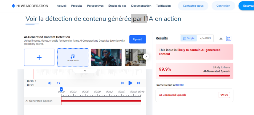Afin d’en avoir le cœur net, nous avons soumis l’enregistrement à l’outil de détection Hive Moderation, spécialisé dans l’identification de contenus générés par intelligence artificielle. L’analyse automatique lui a attribué un score de 99,9 % de probabilité indiquant que la voix aurait été générée par une intelligence artificielle.